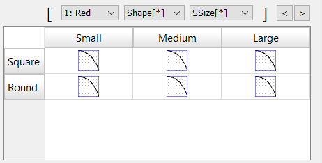 In the following example, the table lets you define the graphical functions for the "Shape" and "SSize" elements for the "Red" color of the first dimension.