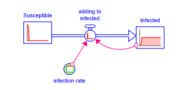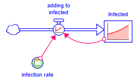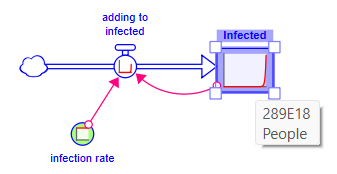 Clearly that is not a reasonable number of infected people. The flow into this level must stop when there are no more susceptible people. To show this click on the stock tool in the Model Build Toolbar and place the stock on the cloud at the left. Depending on your settings for stock or non-negative stock you will see something like: