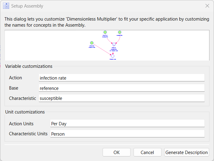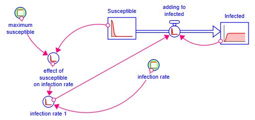 While this is more reasonable, the abrupt cutoff is not right. As the number of susceptible people goes down, it drops the number adding to infected. The dimensionless multiplier is an assembly that can be used to show this diminishing effect. Select it in the assembly panel and choose crowding as the example Than click on add to model and set action to infection rate, base to reference, characteristic to susceptible, action units as per day and characteristic units as person: