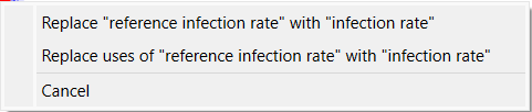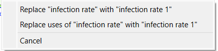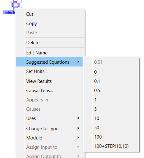 Infections can occur very rapidly. We want to change the infection rate from 0.01 per day (the assembly setting) to 0.5 per day. To do this right click on infection rate, move to the Suggest Equation menu item and then click 0.5 in the submenu.