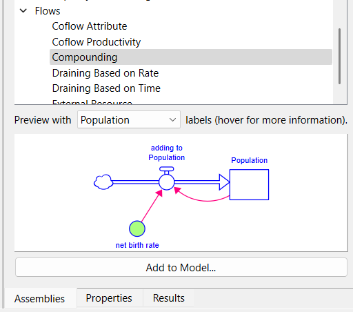 We are looking for a process of infected people causing more infections by coming in contact and transmitting a disease. This is positive feedback, and the assembly that does just that is called compounding. You can scroll through the list of assemblies on the Assemblies Panel (it is under Flows) or type compounding into the search box to filter out other assemblies.