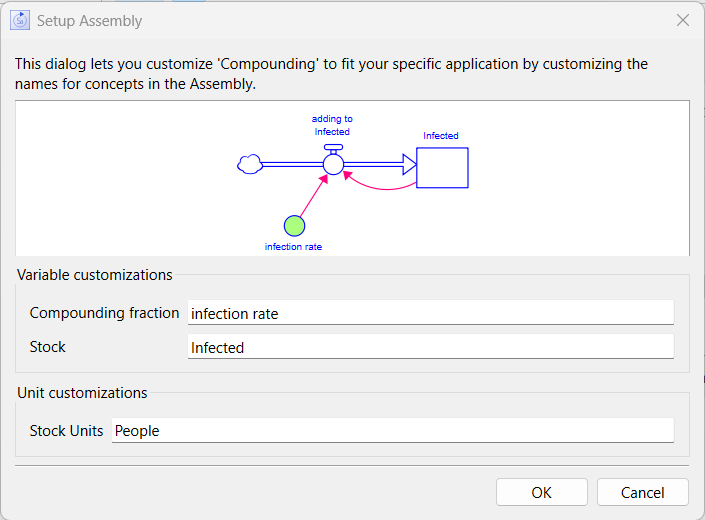 In the Assembly Customization Dialog that comes up after you click on the add to model button above, change Stock to infected and Compounding fraction to infection rate (leave the Stock units as people):