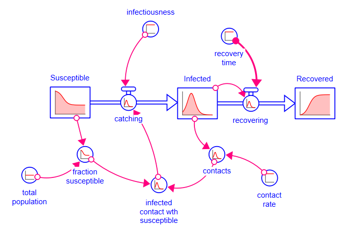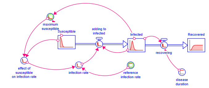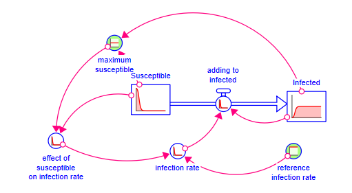 The below model generates the same behavior but explicitly identifies contact between infected and susceptible individuals as the way in which the disease spreads.