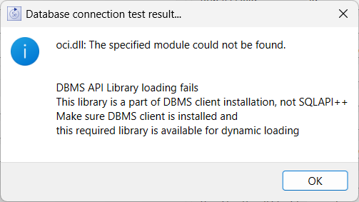 This message is from attempting connection to an Oracle database on Windows. The name of the file that can't be found will be different for different databases and different operating systems.