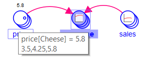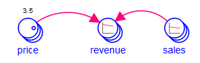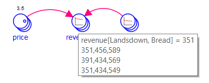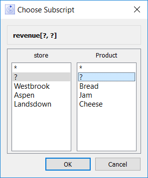 When using Stella Live, all variables are treated implicitly as if they are using wildcards. For example, suppose that you have the variable revenue, arrayed by store and product. On the model diagram the variable revenue will show up as arrayed: