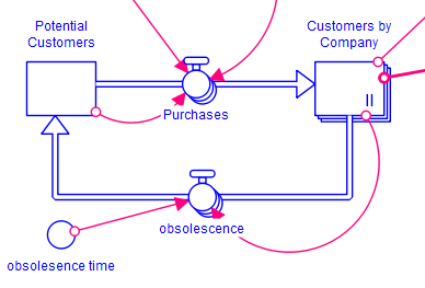 The model is a pricing strategy model for a fictitious (and unspecified) product that uses the array Company to represent three competitors: Google, Amazon and Apple. The model has customers circulating between competitors with departures based on obsolescence and purchased based on the relative attractiveness of each product due to the purchase (one time) and subscription (monthly) prices.