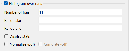 Histogram over runs/Histogram over time, if checked, will present the Bar graph by grouping the values in each simulation and then displaying the number of occurrences in each group. If comparative has been selected the label will be Histogram over runs, if not the label will be Histogram over time. If checked, the below options will also be enabled.