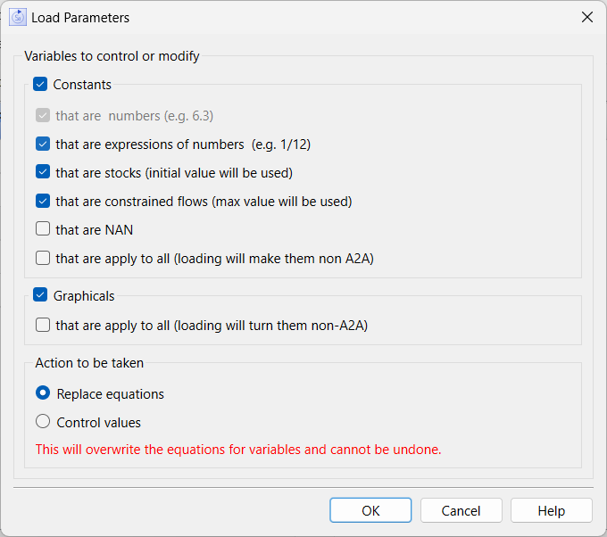 Use the Load Parameters dialog to either set constants and graphical equations in a model to match those in a previous run, or to control constants and graphicals to the values in that run. After setting them new runs will reproduce the assumptions, and if the model has not changed, the result of the existing run.