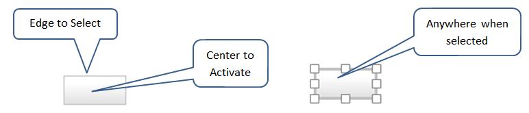 To select the navigation button, click on the edge of the button, or drag to form a rubber band around the button. Once selected, you can drag it as you would any other object. You can also drag it directly (without selecting) by dragging one of the edges as shown above. Clicking on the middle of the button will activate it. Once it is selected you can also use the resize handles to change its size.