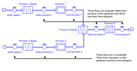 3. Determine the "finish line": The finish line is the point in the conserved-flow chain where you want to collect the cycle-time information. As shown below, the finish line can be any flow that's in the chain downstream of the starting line. There has to be a time-stamped flow upstream in the conserved flow chain, if cycle-time calculations are going to mean anything.