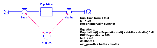 To illustrate how your choices for these options affect table output, we'll use the following simple model, which consists of Population, births, deaths, and net growth.