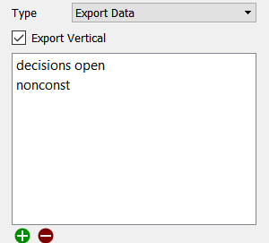 Export Parameter Values will export the parameters that have been set using controls (or that have been set through an import). Constant values will be exported as a number, while graphicals will be exported as x,y pairs. Resetting controls (with Reset After active) will be exported at their current value (they will not reset). Time varying controls that have been imported will not be saved.
