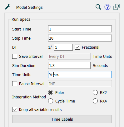 Normally when a model is run values are stored every DT. This provides the complete trail of computation for Euler Integration and a trail sufficient to reconstitute flow values into the changes in stocks for all integration techniques. For large model with many DTs this can result in substantial memory and storage use. By specifying a save interval you can substantially decrease this burden. This is especially important for data collection (see Data Collection) where the data need to be sent across the internet.