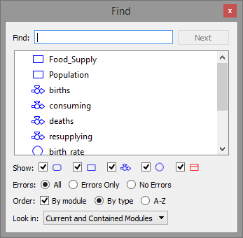 The Find palette will open and display a list of all model variables, sorted by type.