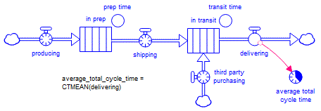 In the following figure, there are two paths to delivering, one involving producing and preparation, the other involving outsourcing to a third party. If producing and shipping are both 1 box per week, and both the prep time and transit time are 1 week, then the average total cycle time will be 1.5 (1 per week that took a 1 week and 1 per week that took 2 weeks). In this example all the flows and conveyance times are constant so the CTMEAN value will start at 0 (at week 0), then change to 1 at week 1, then start to go to the steady state value of 1.5 after week 2.