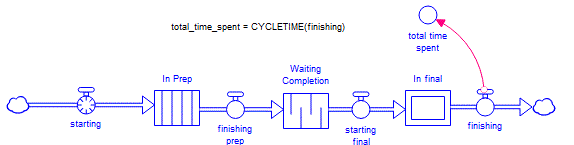 As suggested by the diagram, the procedure associated with making a cycle-time calculation is straightforward. First, time-stamp a flow (or a set of flows) at some point in a stock/flow chain (to time-stamp a flow, check the check box next to the small stopwatch in the flow's dialog). Then, determine from which flow, downstream in the same stock/flow chain, you wish to calculate the cycle-time metric(s). Use a connector and a converter to tap into the downstream flow. Then, define the converter using the appropriate cycle-time builtin.