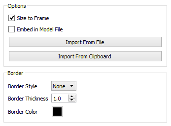 Embed in Model File, if checked, will store the graphic inside of the model file when you save the model. If you import the graphic from the clipboard, this option will be checked and grayed. If you import the graphic from a file, and leave this option unchecked, the original graphic file will be used each time the model is opened.