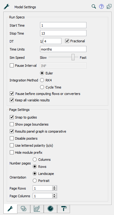 Use the Model Settings Properties panel to set Run Specs and Page settings for the model.
