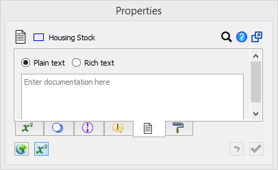 Use the Properties panel to create documentation, enter equations, set styles, and adjust many other attributes of virtually all model objects or the model itself. You can set properties for multiple objects at the same time. The set of tabs available depends on what's selected.
