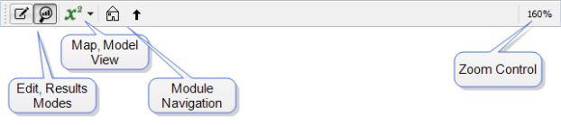 The Mode toolbar can be used to switch between Edit mode to make changes to your models and Results mode to look at model behavior. It is allows you to navigate modules, control zoom and switch between the mapping and modeling views of structure.