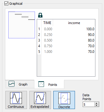 To illustrate the notion of change occurring within a unit of time, let's modify the Cash model to allow income to vary over a month. To implement variation, we'll convert income to a graphical function (using the discontinuous line segment option). The graphical function is shown below. The input to the graphical function is Months (running from 0 to 1.0, in increments of 0.25). The output of the graphical function is income, which now declines over the month.