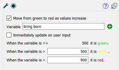 The second When the variable is > than lets you specify the value at which the color will transition from the second to the third color shown. When the variable exceeds this value, the color at the right will be displayed. If the first check box isn't checked, >is replaced by < in the label and the meaning.