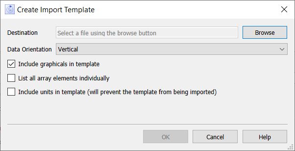 Importing data from a file requires that the variable names in the file match those in the model. You can create a template file for this, with all the constants in the model includes, by using the create import template dialog. This dialog is opened from the Import Data dialog box.