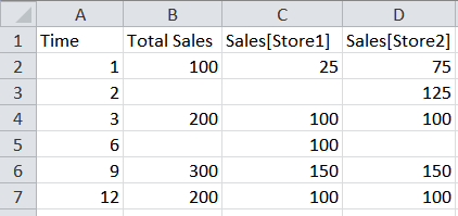 The values in the time row or column must be increasing, but they do not need to be uniform. In the above example the first increase by 1, then by 3. In addition, there may be blank values for any of the variables. These values are considered to be missing. They work the same way that they would if there were no time entry for that time.