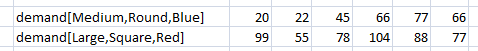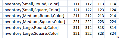 Consider a three-dimensional array on Size (Small, Medium, Large), Shape (Round, Square), and Color (Red, Green, Blue, Yellow). A horizontal link to initialize inventory would use: