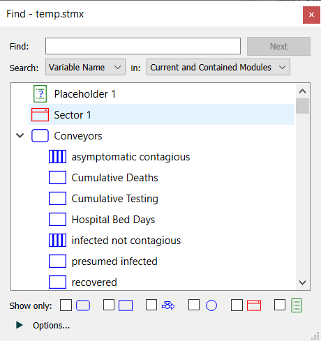 Select the check boxes for the types of variables you want to include in the search: modules, stocks, flows, converters, sectors, or placeholders. By default, when nothing is checked, the Find window looks for all variables. Note that only variable types that exist in the current model are shown.