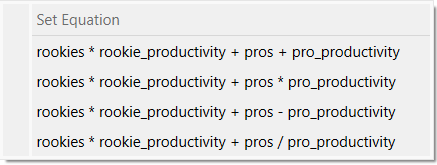 If there are already two or more connectors and you add another, the list of equations offered will be based on the existing equation. Thus, for example, if the existing equation is rookies*rookie_productivity+pros and you add a connector from pro_productivity you will get: