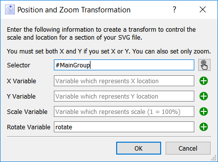 to add a new transformation, using the Movement Transform dialog. This time, leave everything except Rotate blank, and set that value to the variable rotate.