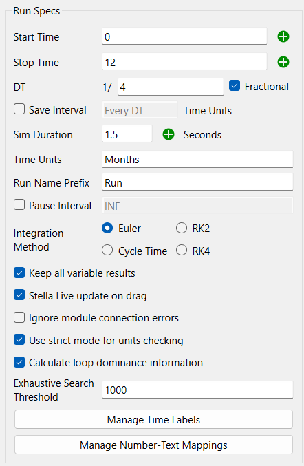 The values you enter here depend on the Time Units you've chosen for the model. For example, if Time Units is set to Months and you want to run the simulation for a year (12 months), you'd specify 0 and 12 (or 1 and 13, if you prefer to report financial style values) as the Start and Stop times. Or, if the unit of time is Years and you wanted to run the simulation from one specified year to another, you could type 1970 and 2010 as the Start and Stop times. If you wanted to run the simulation for 100 years, you could type 0 and 100 as the Start and Stop times.