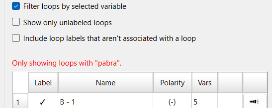 Include loop labels that aren't associated with a loop, if checked, will list the loop labels which include variables that do not form a loop, or that form a loop already marked by another loop label. This is helpful to be sure you have not placed any labels incorrectly. Adding missing variables to such loop labels, or deleting them and replacing them with a new label as described below, can correct any issues you discover. As you make these change the list of leftover labels will change.