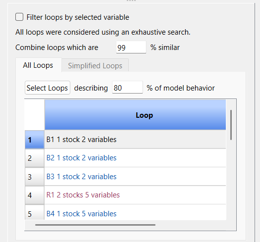 This is a list of loops discovered in the model. The Simplified Loops tab is only available when viewing the simplified CLD as described in CLD Generation and noted below.