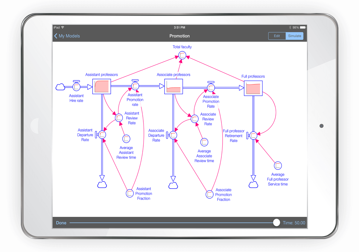 Stella Modeler allows you to quickly create Stock and Flow diagrams that provide insight into dynamic processes. With the touch of your finger build multi-level, hierarchical model structures using modules and map out the overall causal relationships of your system.